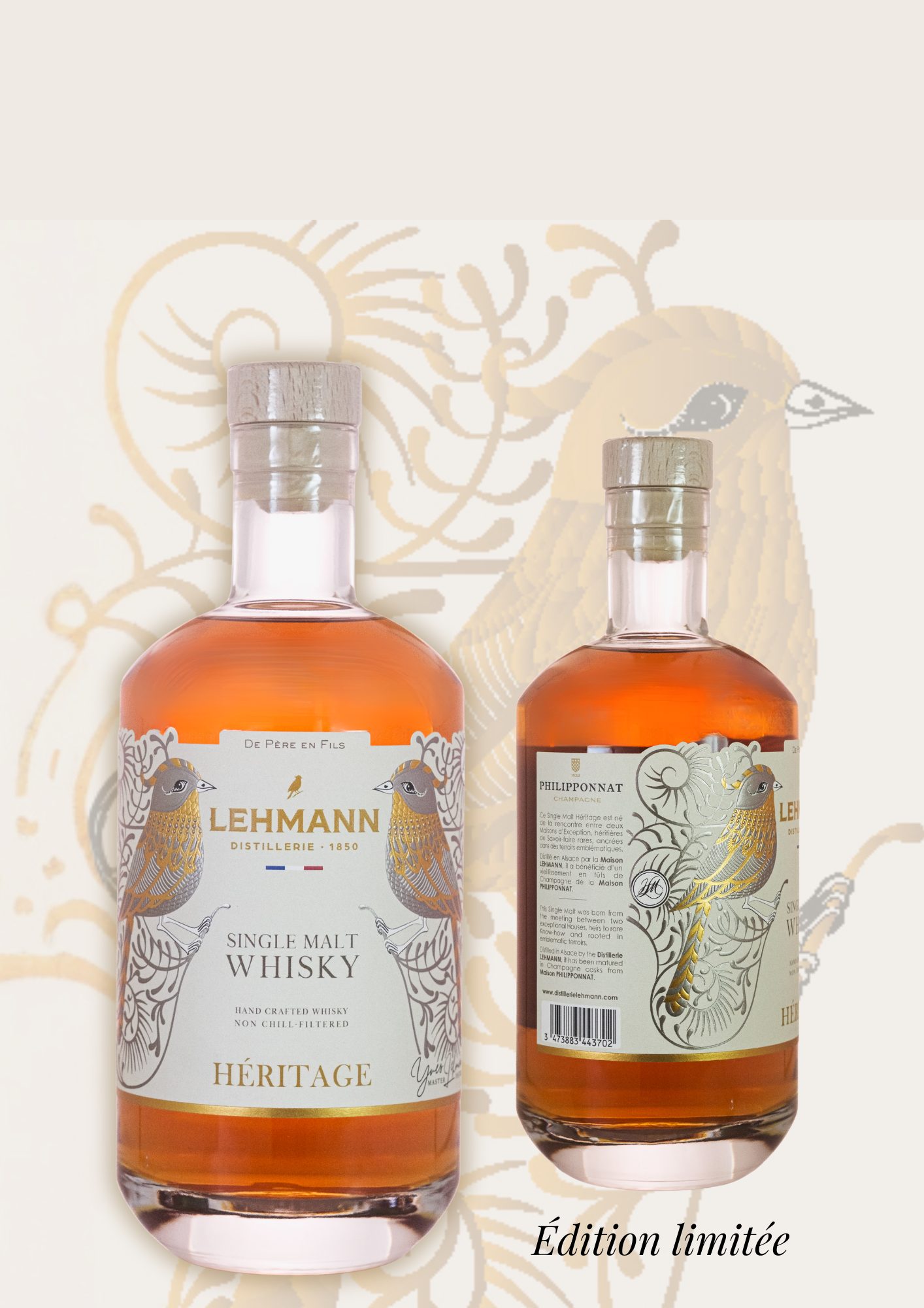 Avec HÉRITAGE, la Distillerie LEHMANN signe bien plus qu’un whisky : elle célèbre la rencontre entre deux histoires françaises, deux lignées familiales animées par la même exigence du geste et du temps. Cette création rend hommage à la transmission, à la patience et à l’élégance du savoir-faire. En choisissant de vieillir son Single Malt en fûts de Champagne PHILIPPONNAT, la Maison fait dialoguer deux univers d’excellence pour donner naissance à un whisky d’émotion et de caractère, symbole d’un art français intemporel.